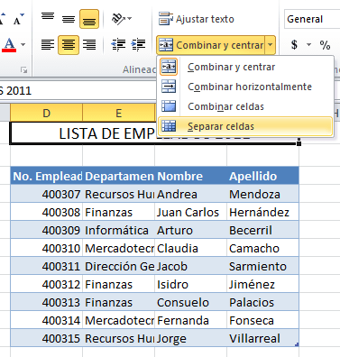 El botón Combinar y centrar permanecerá resaltado indicando que dichas celdas han sido combinadas, así que para regresar las celdas a su estado normal deberás hacer clic de nuevo sobre el botón Combinar y centrar para dividir de nuevo las celdas. También puedes hacer clic en el menú desplegable del botón y seleccionar la opción Separar celdas.