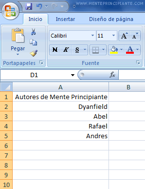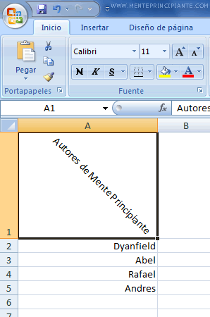 Supongamos que tu hoja de calculo de excel sea como la que mostramos a continuación y desee cambiar la orientacion de la celda A1, por el simple hecho de ser un poco mas larga que los demas.