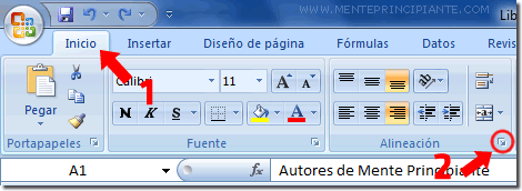Para empezar con la orientación, vamos a hacer clic en la celda que queremos orientar (en nuestro caso la celda A1). Inicio > haga clic en la flecha en la esquina superior derecha de la sección Alineación.