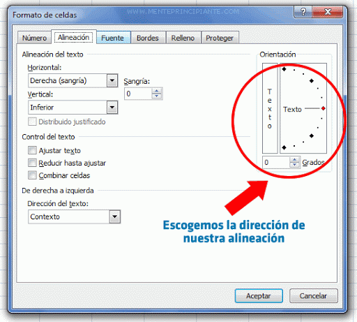 Esto abrirá la ventana del formato de celdas. En la parte derecha de la ventana, observe que se pueden elegir libremente la dirección del texto en cualquier dirección desde -90 grados hasta 90 grados. La alineación por defecto, por supuesto, es cero grados.